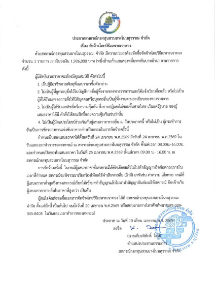 #กำหนดยื่นซองประกวดราคา ได้ตั้งแต่วันที่ 24 เมษายน 2569 ตั้งแต่เวลา 08.00 - 16.00 น. ณ สหกรณ์กองทุนสวนยางโนนสุวรรณ จำกัด เลขที่ 109 หมู่ 5 ถนนดงบัง - ม่วงงาม ตำบลดงอีจาน อำเภอโนนสุวรรณ จังหวัดบุรีรัมย์