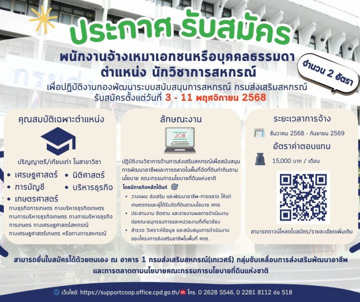 📢 กรมส่งเสริมสหกรณ์ เปิดรับสมัครพนักงานจ้างเหมาเอกชนหรือบุคคลธรรมดา ตำแหน่ง : นักวิชาการสหกรณ์ จำนวน 2 อัตรา